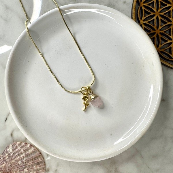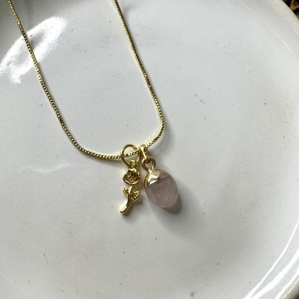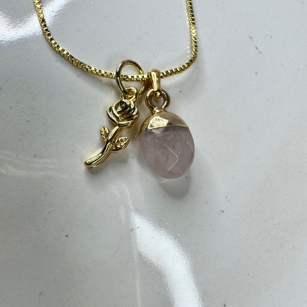 Conjunto Cuarzo rosa, dije Rosa y cadena, baño de oro 18k